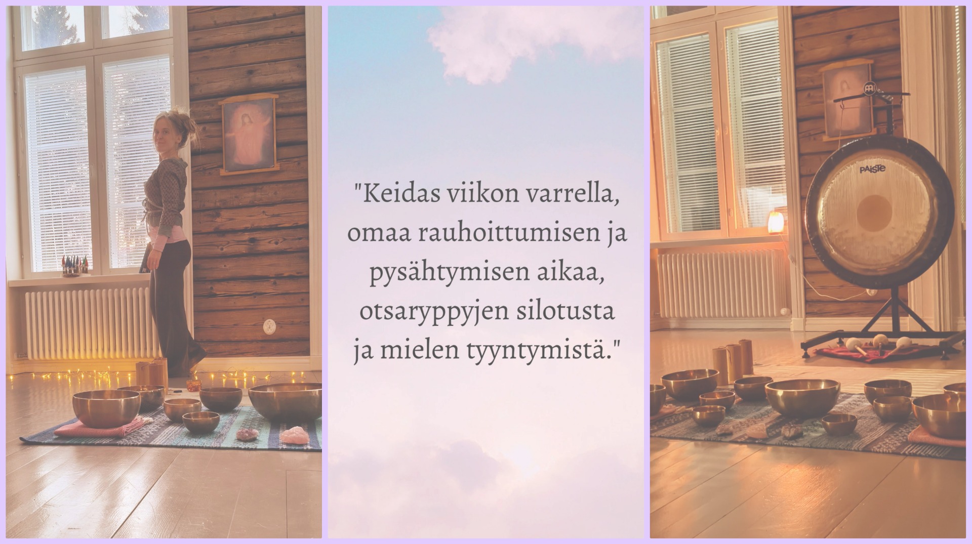 Lempeässä äänimaisemissa saat mahdollisuuden hellittää ja huuhtoutua äänimaljojen ja ison gongin täyteläisissä soinnuissa ja värähtelyissä.